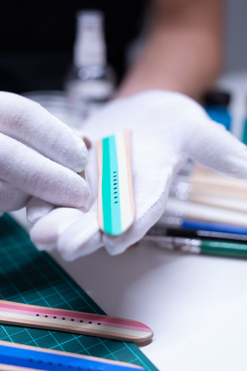 From the moment you design your strap in our configurator, the journey to a one-of-a-kind creation begins. Your choices – colors, details, and style – are brought to life by our artisans using high-quality materials and precise craftsmanship. Each strap is hand-painted with care to realize your vision.